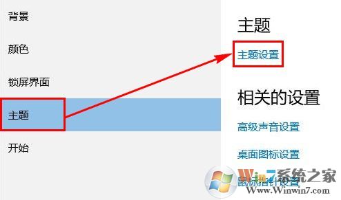 2、在打開的“設(shè)置”窗口中,選擇左側(cè)的“主題”選項,右側(cè)點擊“主題設(shè)置”,如下圖所示: