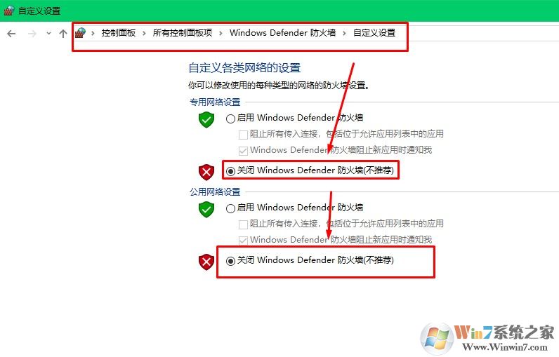 3、點擊啟用和關(guān)閉windows defender 防火墻。并關(guān)閉所有網(wǎng)絡(luò)狀態(tài)下的防火墻。