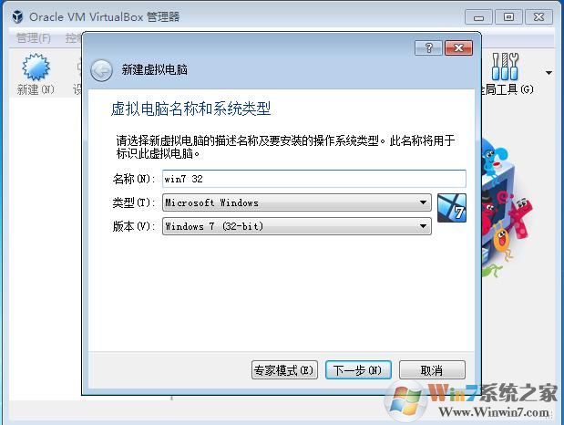 2、給虛擬機指定一個名稱,如win7 32 在下面版本中對應選擇Windows7 32-bit;