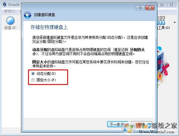 6、如果不確定要使用多少空間,而且磁盤緊張的話可以選擇動態(tài)分配,反之固定大小性能會更好;