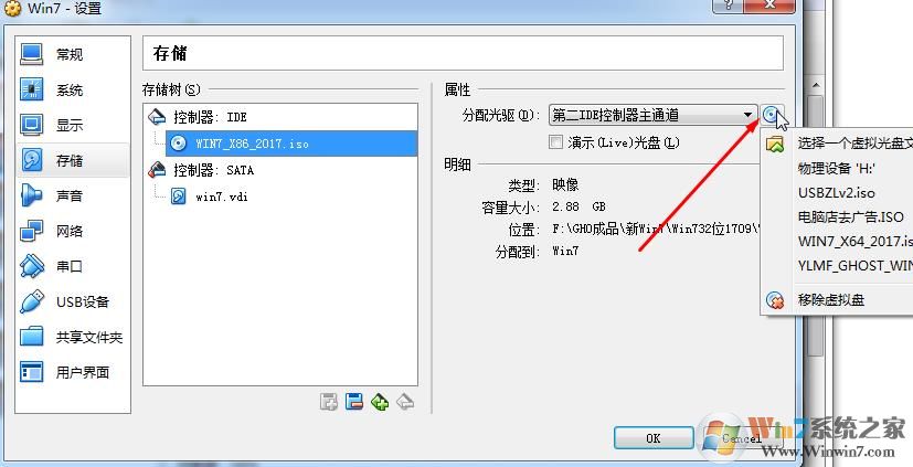 9、點擊設(shè)置,然后選擇到【儲存】,如下圖所示,選擇一個虛擬光盤文件(ISO格式可啟動類型的);