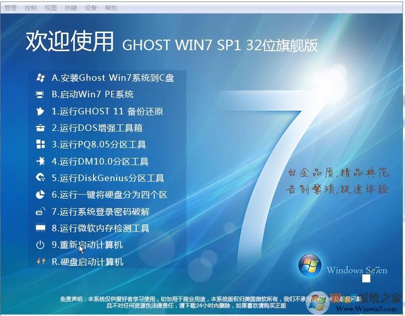 11、這時出現(xiàn)光盤啟動界面了,基本上到這里,大家都會知道如何安裝Win7系統(tǒng)了吧,進WinPE:分區(qū)、GHOST到C盤,一切就跟實體機一樣安裝。