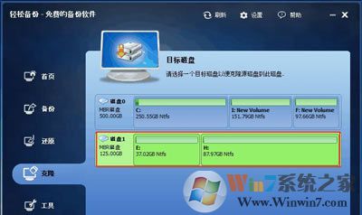 1、 下載免費(fèi)的輕松備份,安裝并運(yùn)行。這里以克隆磁盤(pán)0到磁盤(pán)1為例。來(lái)到主頁(yè)面 “克隆”欄下選擇“磁盤(pán)克隆”。