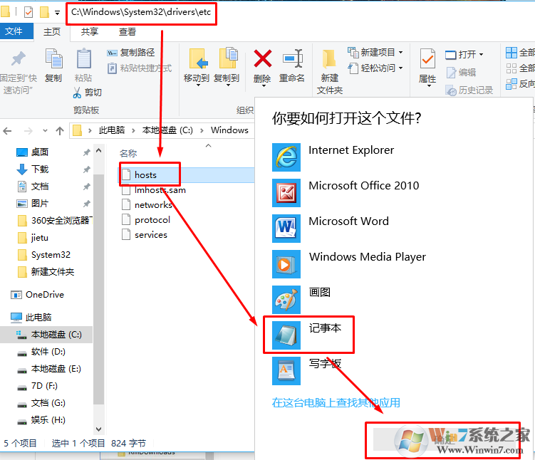 1、打開此電腦,在此電腦中依次展開:C:\Windows\System32\drivers\etc,在ect文件夾中找到hosts文件,單擊右鍵,選擇打開方式,然后選擇記事本,點(diǎn)擊確定;