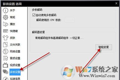 2、在彈出的菜單欄中,選擇“多核設(shè)置”,在點(diǎn)擊“智能修復(fù)”。