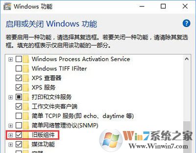 3、打開windows 功能框后,將右側(cè)的滑塊移動到底部,找到 舊版組件;