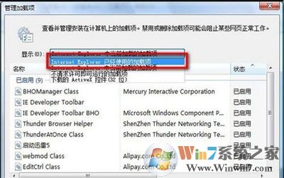 3、這時在頁面“顯示”選項的選擇中,選擇“Internet Explorer 已經(jīng)使用的加載項”,會列出調(diào)用IE內(nèi)核的所有程序控件;
