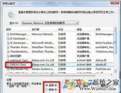 在加載項中,選擇”EditCtrl Class“加載項,下方會顯示這個加載項的“啟用”或是“禁用”的選擇。