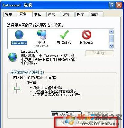 5、在彈出的頁面中,直接選擇“安全”,鼠標選擇“Internet”,在下方有一個“將所有區(qū)域重置為默認級別”這個按鈕,如果是灰色的,說明不能點擊,就不用做任何操作;