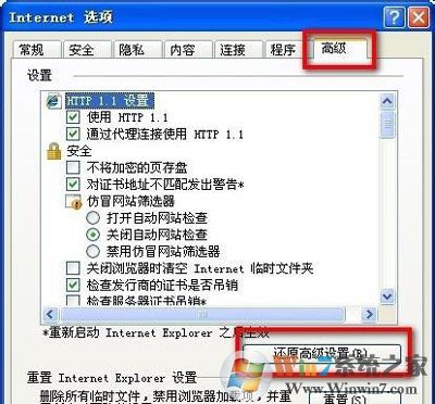 6、鼠標選擇“Internet”,點擊“高級”—“還原高級設置”,記得最后選擇“確定”,這樣就完成所有設置;