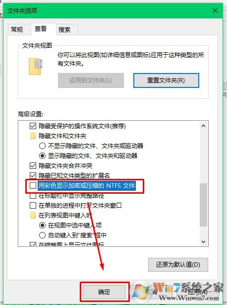 2.在打開(kāi)的文件夾選項(xiàng)窗口中,切換到“查看”項(xiàng),在“高級(jí)設(shè)置”框中,去掉“用彩色顯示加密或壓縮的NTFS文件”前面的鉤,最后點(diǎn)擊確定保存即可恢復(fù)成黑色。如下圖所示