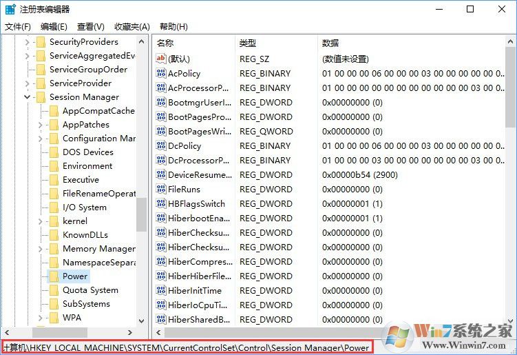 2、在左側(cè)依次展開:HKEY_LOCAL_MACHINE\SYSTEM\CurrentControlSet\Control\Session Manager\Power ;