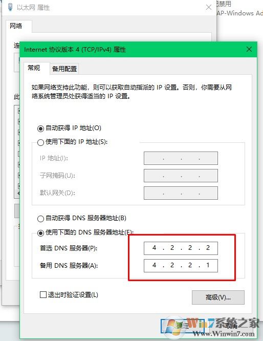 5、打開internet 本地連接,將dns服務器設置為(首選)4.2.2.2和備用4.2.2.1.