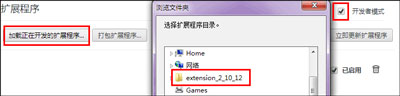 6、進入擴展程序中心,啟用開發(fā)者模式,加載正在開發(fā)的程序包,選擇剛才的文件夾就行了,搞定!