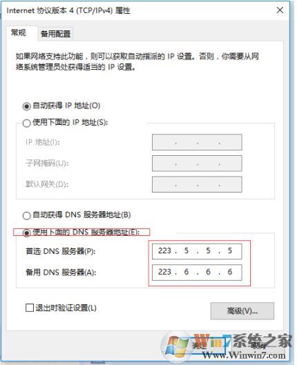④.打開頁面后勾選“使用下面的DNS服務器地址”并且填入“223.5.5.5”和“223.6.6.6
