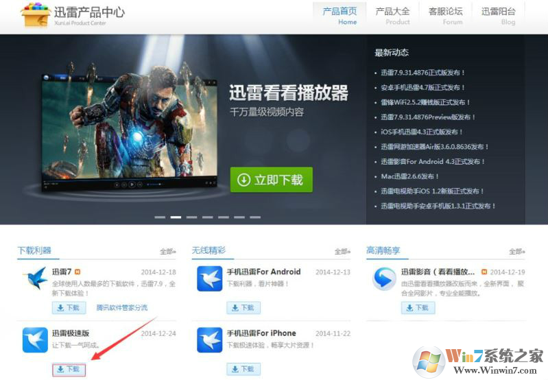 3、請登錄到迅雷產(chǎn)品中心這個頁面,下載一個迅雷極速版的安裝包測試查看一下是否同樣的情況進(jìn)行判斷是個別資源的問題還是全部資源的問題。