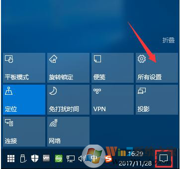 1、點擊系統(tǒng)桌面右下角的【操作中心】圖標,在打開的【操作中心】側邊欄中點擊【所有設置】;