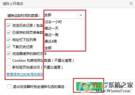 2、打開后彈出一個對話框,在彈出的對話框中注意選擇要清理的選項。接著要記得在“清除這段時間的數(shù)據(jù)”選項中選擇清理的時間段,一般選擇“全部”;