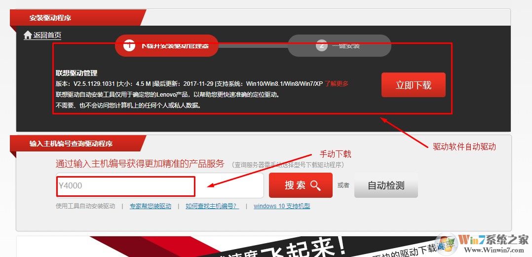 2、選擇手動下載網(wǎng)卡驅(qū)動的話輸入主機編號即可,也可以直接下載聯(lián)想提供的驅(qū)動程序管理軟件進(jìn)行自動驅(qū)動。