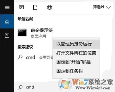 1、按Win+S打開搜索框,在搜索框中輸入cmd,在列表中右鍵命令提示符選項(xiàng)“以管理員身份運(yùn)行”并打開。