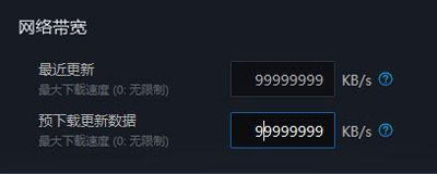 2、在設置界面左側點擊【游戲安裝/更新】,然后在右側將【網(wǎng)絡寬帶】下面的【最近更新】和【預下載更新數(shù)據(jù)】后面的速度都設置成99999 ,點擊【完成】保存設置重啟戰(zhàn)網(wǎng)嘗試進行更新安裝!