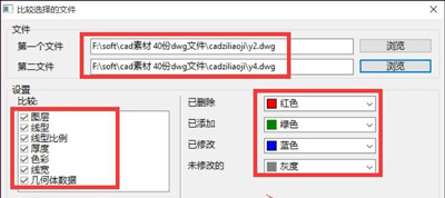 5、在“對比文件”窗口中,還需要勾選想要進行對比的內(nèi)容以及相關(guān)顏色標識,點擊確定按鈕后就可以顯示相關(guān)對比內(nèi)容了。