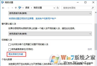 4、打開高級設(shè)置后,點擊“更改語言熱鍵”藍(lán)色字樣;