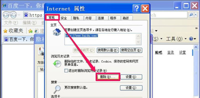 10、在Internet選項的“常規(guī)”選項卡中,點擊“刪除”按鈕。