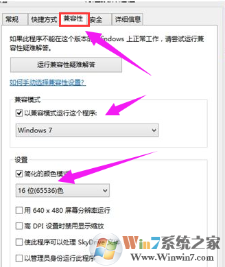 將“兼容”模式更改為Win7或XP,勾選“簡化的顏色模式”,選擇顏色為 16位,然后點(diǎn)擊應(yīng)用