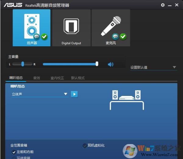 2、打開聲音管理器,可以看到揚(yáng)聲器有四個(gè)選項(xiàng):喇叭組態(tài)、音效、室內(nèi)矯正、默認(rèn)格式;