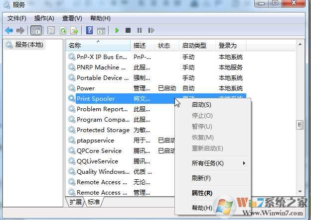 2、在右側(cè)將“printspooler”服務(wù)單擊右鍵,選擇“啟用”,如果啟用為灰色的話需要雙擊去服務(wù)屬性中把啟動類型設(shè)置為自動。