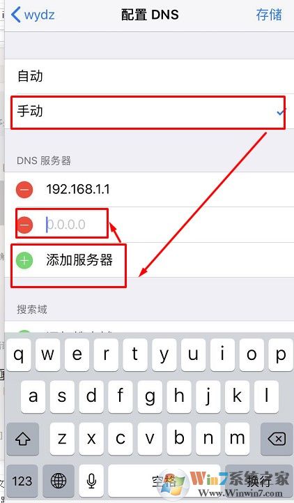 6、見過nds選擇為手動,然后點擊添加。接下來在 DNS 中輸入 8.8.8.8 或 114.114.114.114 地址,再點擊頂部的“無線局域網(wǎng)”返回,