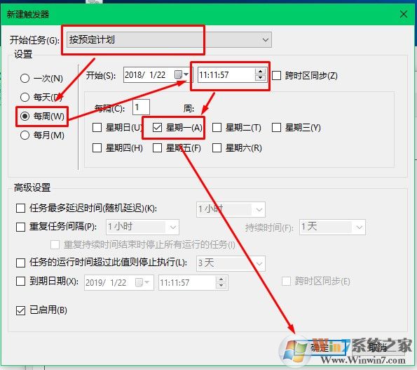 5、選擇按預(yù)定計(jì)劃,然后將時(shí)間和自動(dòng)運(yùn)行的頻率設(shè)置好,每周運(yùn)行一次還是每天運(yùn)行一次,這里建議每周清理一次垃圾即可。