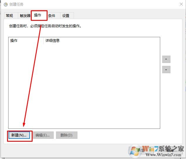 6、切換到操作---新建。該步驟是在設(shè)置計(jì)劃需要打開的程序。