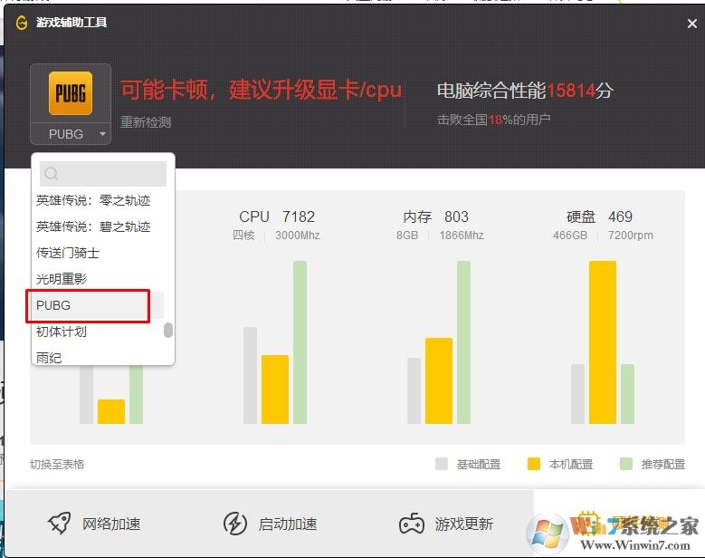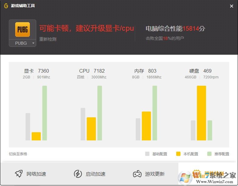 5、接下來我們就可以看見自己的電腦配置是否可以玩吃雞游戲了。下圖就是小編的電腦配置了,結(jié)論是會卡頓建議升級cpu和顯卡。從下圖我們可以看見灰色的條狀是基本配置也就是勉強(qiáng)可以玩這款游戲的配置。黃色條是自己本機(jī)的配置了、綠色條是推薦配置也就是可以五障礙玩這款游戲的配置了。所以總結(jié)下來就是如果所有的黃色的條高于灰色條的話你就可以正常吃雞了,如果是黃色條高于或者接近綠色調(diào)那么恭喜你可以非常舒適的玩這款游戲了。黃色條低于灰色條的話那么就趕緊去升級自己的電腦配置吧。