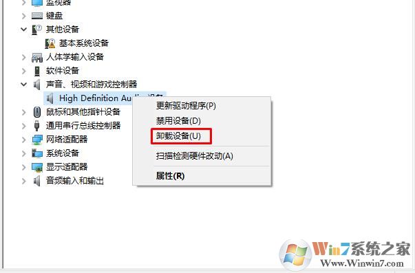 3、右鍵點擊high Definition Audio設(shè)備 選擇卸載設(shè)備;