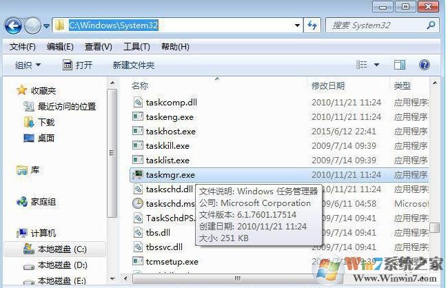 1、進(jìn)入C:\Windows\System32目錄,找到taskmgr.exe,雙擊打開(kāi);