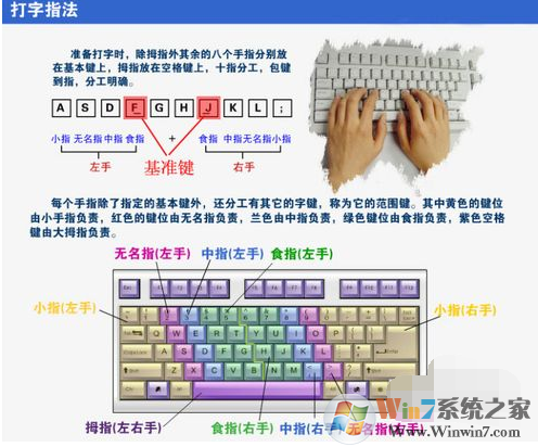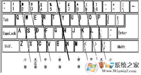 所謂標準指法就是把你的雙手依照下圖的位置放在鍵盤上,即讓你的左手食指放在字母F上(F鍵上有一個小突起,我們通常稱之為盲打坐標),右手食指放在字母J上(J鍵也有一個盲打坐標)然后將四指并列對齊分別放在相鄰的鍵鈕上。