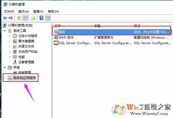 2、進入到計算機管理后,點擊左側下面的“服務和應用程序”,點選“服務”