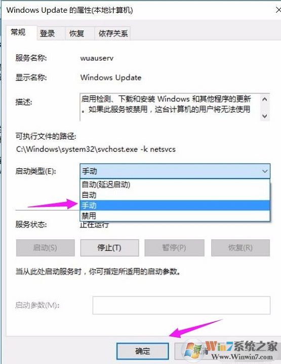 4、進入到屬性界面后,在啟動類型中選:手動。點擊確定后退出設置