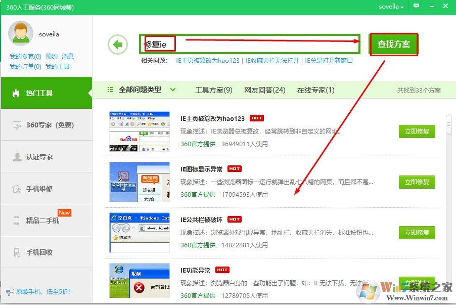 2、在搜索欄中輸入修復ie或者自己相應的問題我們就可以找到相關問題的解決方法了,然后點擊立即修復即可。