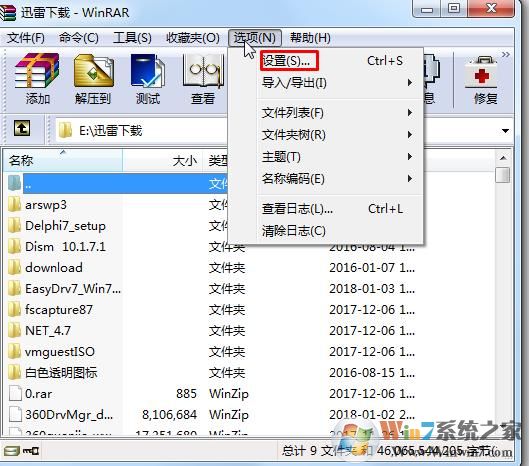 2、在WinRAR界面,點(diǎn)擊 選擇—設(shè)置;