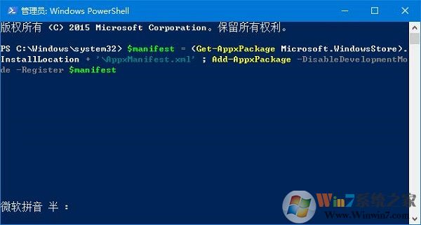 2、在PowerShell 框中輸入:$manifest = (Get-AppxPackage Microsoft.WindowsStore).InstallLocation + '\AppxManifest.xml' ; Add-AppxPackage -DisableDevelopmentMode -Register $manifest 按下回車鍵進行修復。