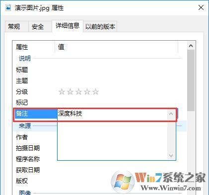 2、在照片屬性界面點(diǎn)擊“詳細(xì)信息”選項(xiàng)卡,找到“備注”一欄,點(diǎn)擊“備注”后面空白的“值”,就可以輸入需要備注的文字,輸入完成后點(diǎn)擊應(yīng)用并確定即可。