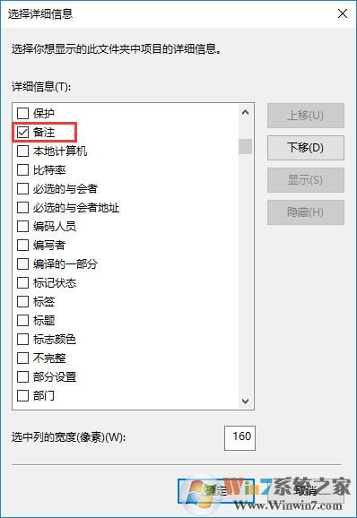 3、在詳細(xì)信息框中找到“備注”并將其勾選起來,點(diǎn)擊“確定”就可以了。