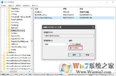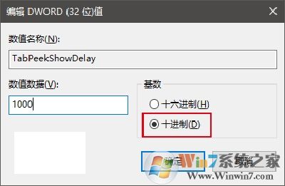 ② 雙擊后在數(shù)值數(shù)據(jù)輸入時間值,要調(diào)整為“十進制”,如果你想讓鼠標離開標簽頁后預覽畫面顯示時間+1秒,就輸入1000(如下圖,再長就感覺像程序卡頓,當然想延長幾秒大家隨意……),然后點擊“確定”后重啟Edge瀏覽器生效。