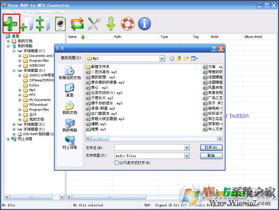 3、進入主界面以后,接下來用戶就可以使用Free WAV to MP3 Converter來轉(zhuǎn)換音頻文件了,首先單擊主界面左上角的“添加音頻文件”按鈕,然后在打開的窗口當中選擇你要進行轉(zhuǎn)換的音頻文件。