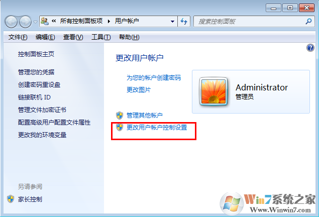 4、單擊更改賬戶信息最后一個(gè)選項(xiàng):更改用戶賬戶控制設(shè)置。