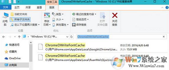 打開資源管理器—此電腦,在搜索框中輸入ChromeDWriteFontCache,如下圖所示,將所有搜索到的項目刪除,重新打開瀏覽器時會自動重建這些緩存文件,此時即可恢復正常。
