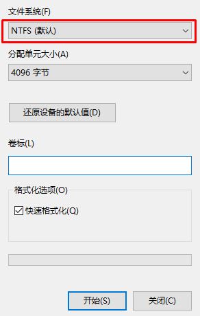 2、在格式化界面中就可以將文件系統(tǒng)設(shè)置為NTFS,點擊【開始】,耐心等待格式化完成后即直接復(fù)制大文件到U盤中。